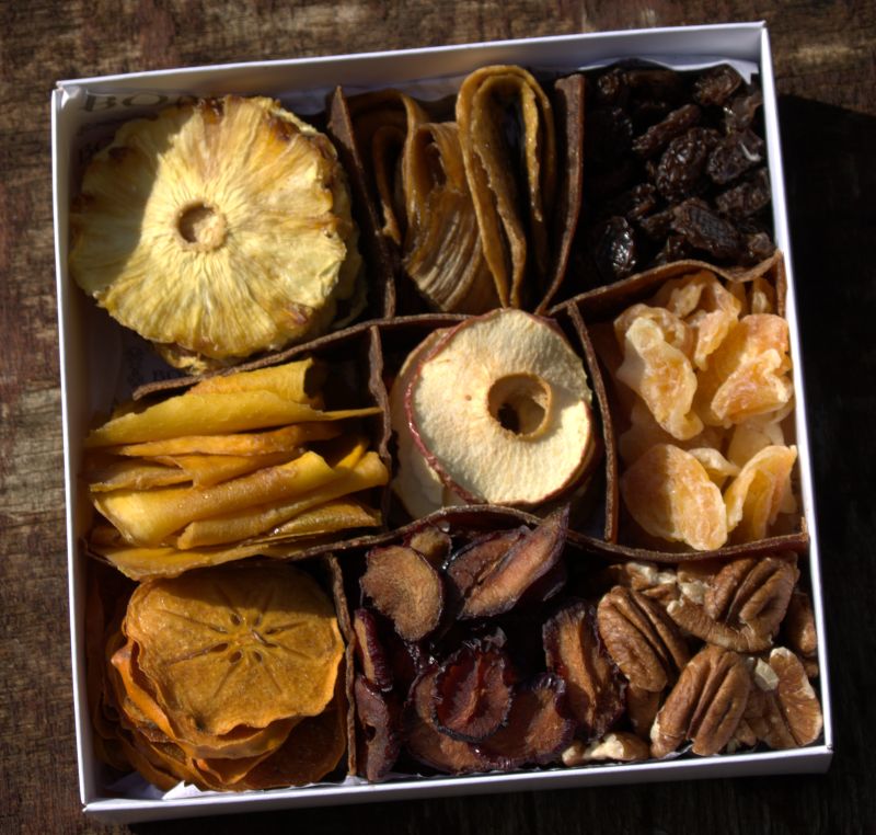 שזיף, פקאן, אפרסמון, אננס, צימוק, בננה, מנגו, מנדרינה ותפוח.